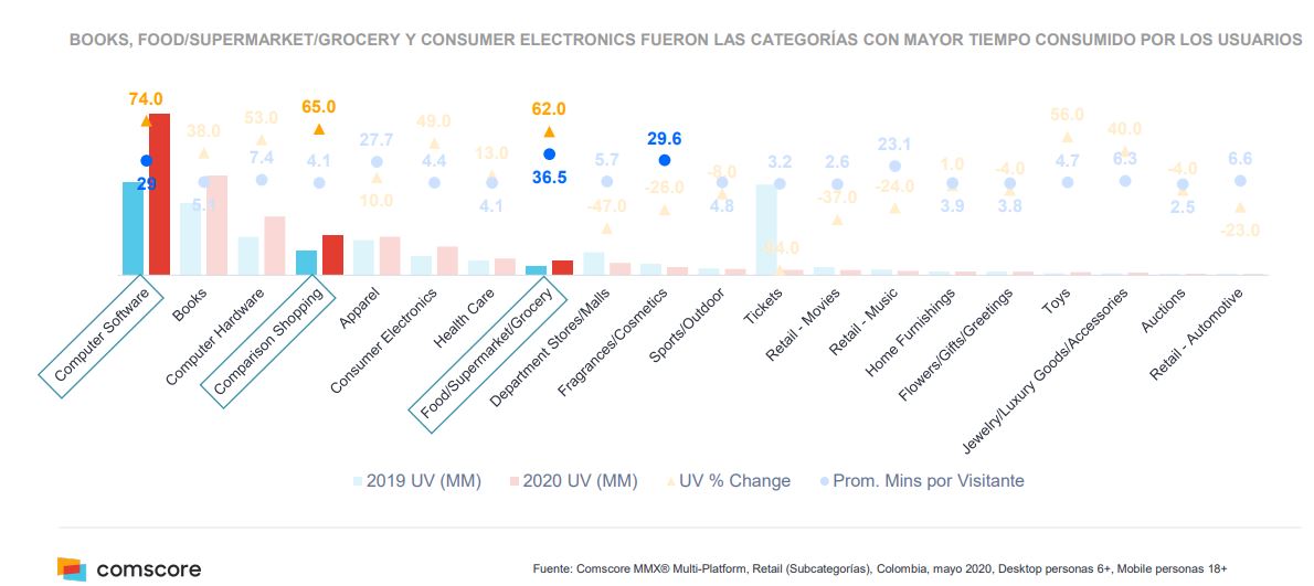 ComScore es una compañía de investigación de marketing digital que proporciona estudios del comportamiento de usuarios en línea. En sus más recientes estadísticas que toman información de sus estudios y muestran que en Colombia y otros países de Latinoamérica las ventas al por menor han crecido con respecto al año anterior. Aunque el auge lo tienen las ventas de aplicativos de software, se observa que existe un crecimiento en casi todos los temas.
